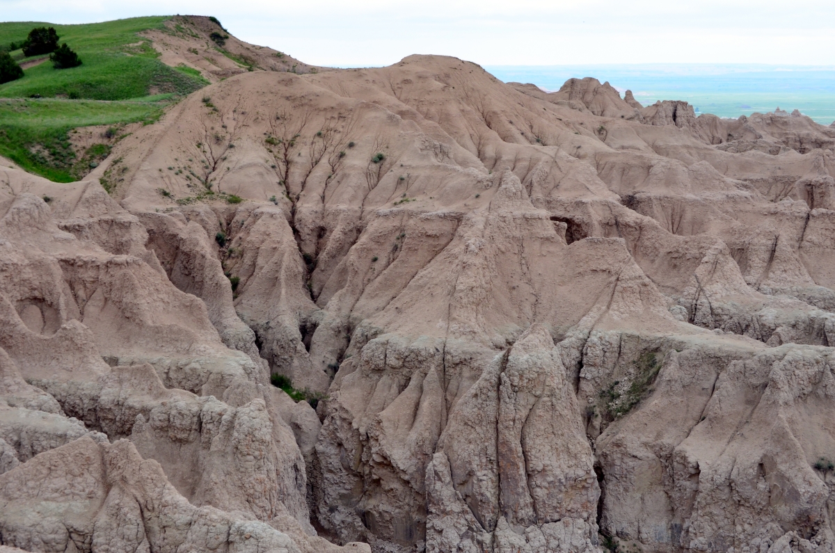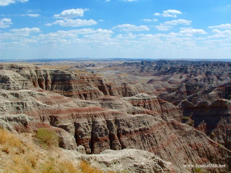 At Badlands National Park, weird shapes are etched into a plateau of soft sediments and volcanic ash, revealing colorful bands of flat-lying strata. The stratification adds immeasurably to the beauty of each scene, binding together all of its diverse parts. A geologic story is written in the rocks of Badlands National Park, it is an account of 75 million years of accumulation with intermittent periods of erosion that began when the Rocky Mountains reared up in the West and spread sediments over vast expanses of the plains. The sand, silt, and clay, mixed and interbedded with volcanic ash, stacked up, layer upon flat-lying layer, until the pile was thousands of feet deep. In a final phase of volcanism as the uplift ended, white ash rained from the sky, completing the building stage.