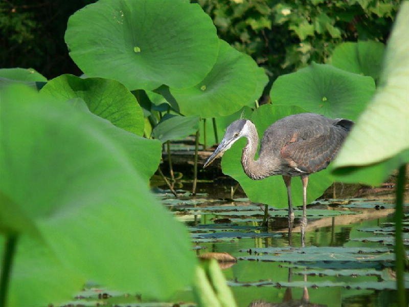 American Lotus, a brilliant water lily, is abundant in the lake's shallow areas. It is unusual to find such a large colony of lotus on an inland lake. The plant's leaves grow up to two feet in diameter supporting large yellow flowers.